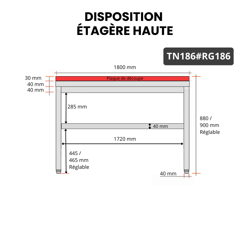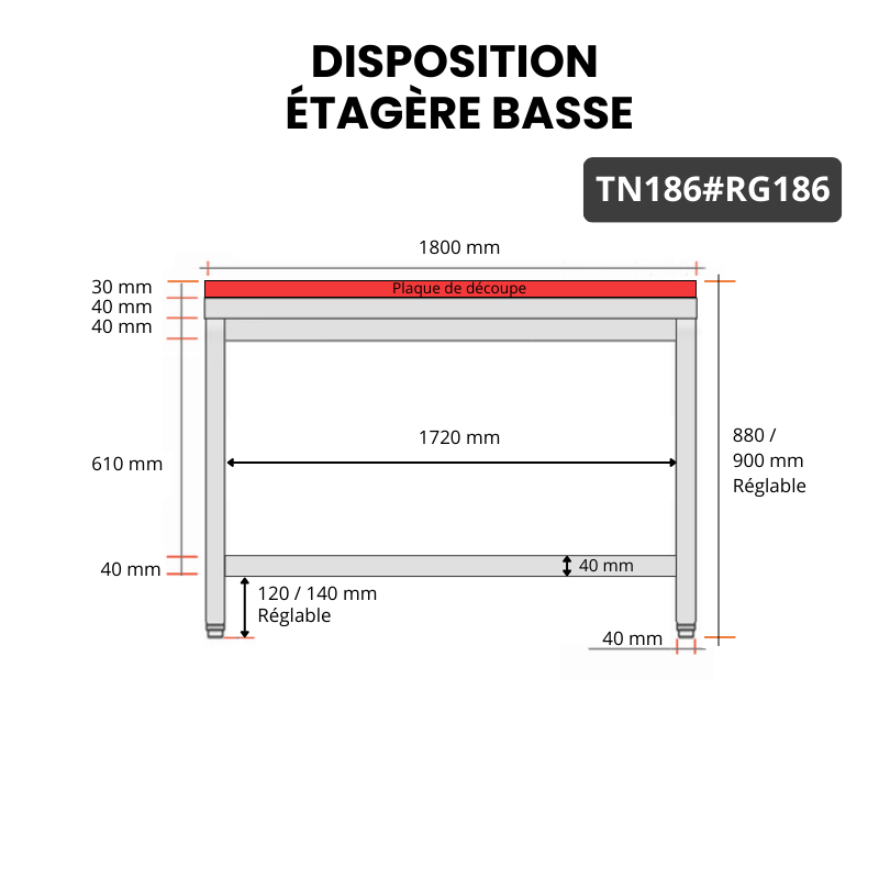 • Table de travail professionnelle en acier inoxydable AISI 304 haut de gamme et plaque de découpe en polyéthylène rouge alimentaire