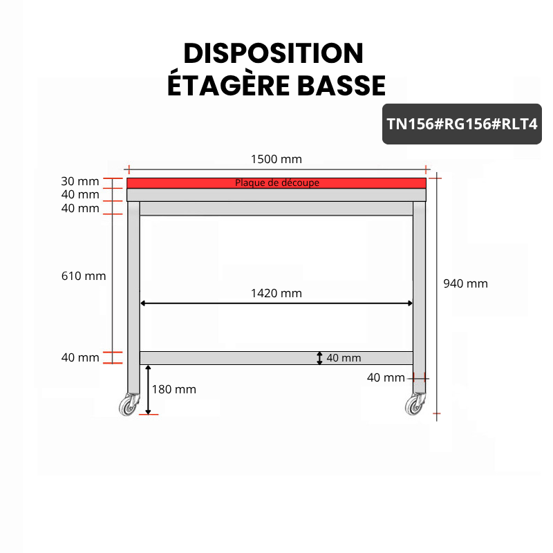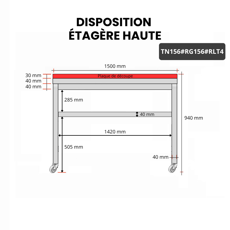 Table de travail en inox 1600x600 mm avec plaque de découpe rouge sur roulettes PREMIUM - GOLDINOX