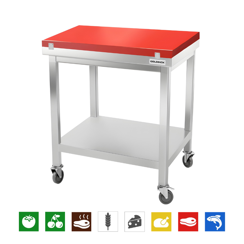 Table de travail en inox 600x700 mm avec plaque de découpe rouge sur roulettes PREMIUM - GOLDINOX