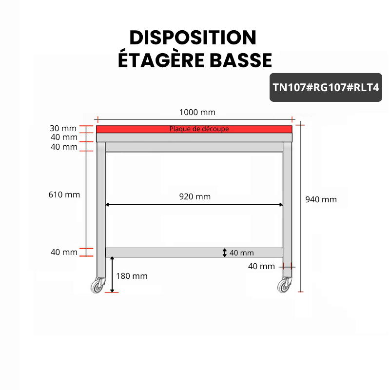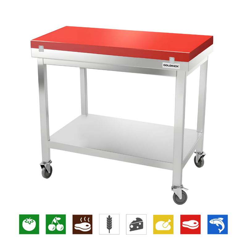 Table de travail en inox 1000x700 mm avec plaque de découpe rouge sur roulettes PREMIUM - GOLDINOX
