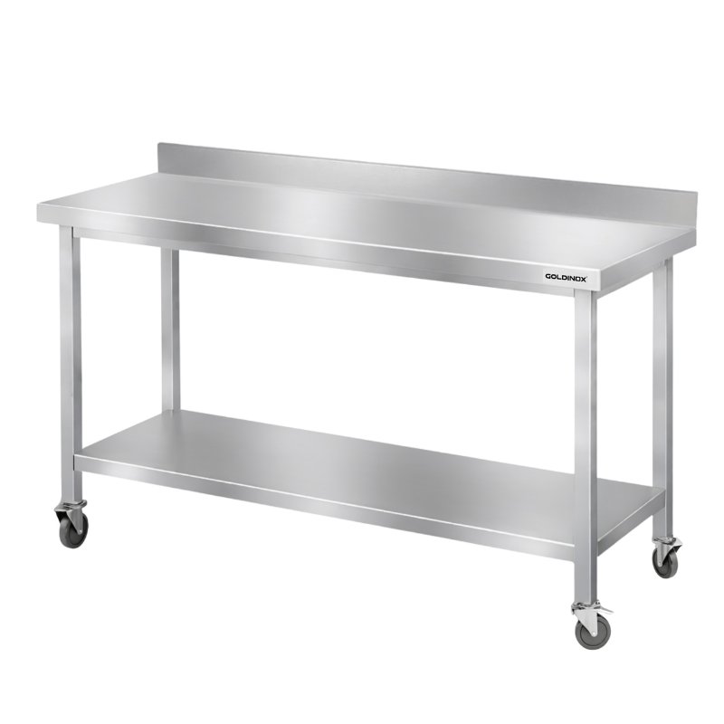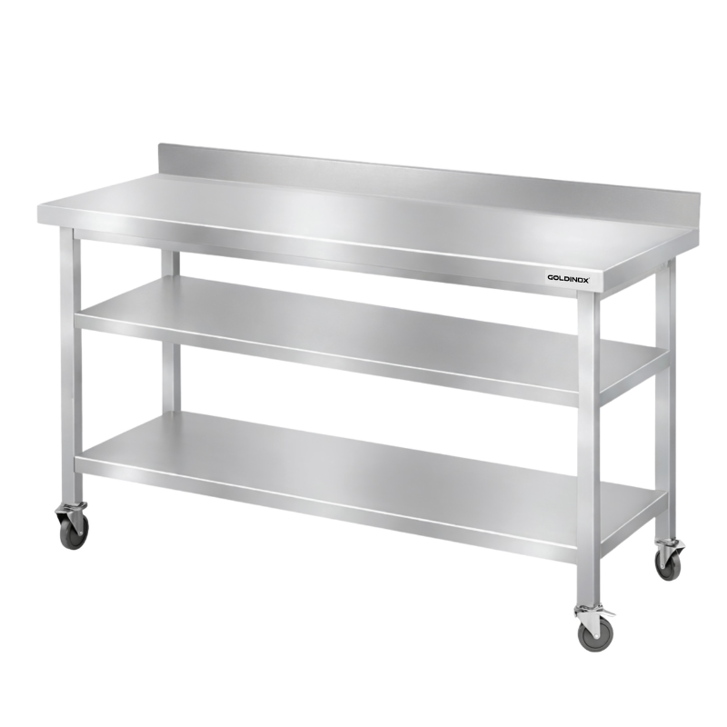 Table de travail en inox Bar 1500x500 mm avec 2 étagères inférieures et dosseret sur roulettes PREMIUM - GOLDINOX