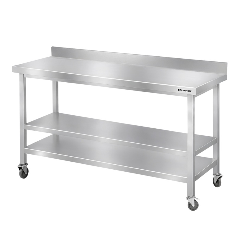 Table de travail en inox Bar 1400x500 mm avec 3 étagères inférieures et dosseret sur roulettes PREMIUM - GOLDINOX