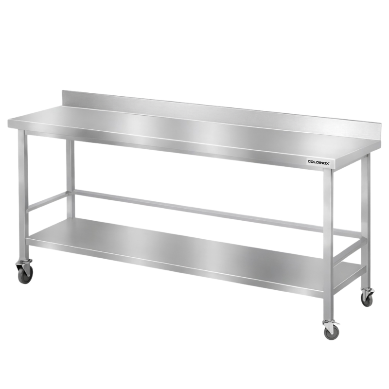 Table de travail en inox Bar 2000x600 mm avec renfort et dosseret sur roulettes PREMIUM - GOLDINOX