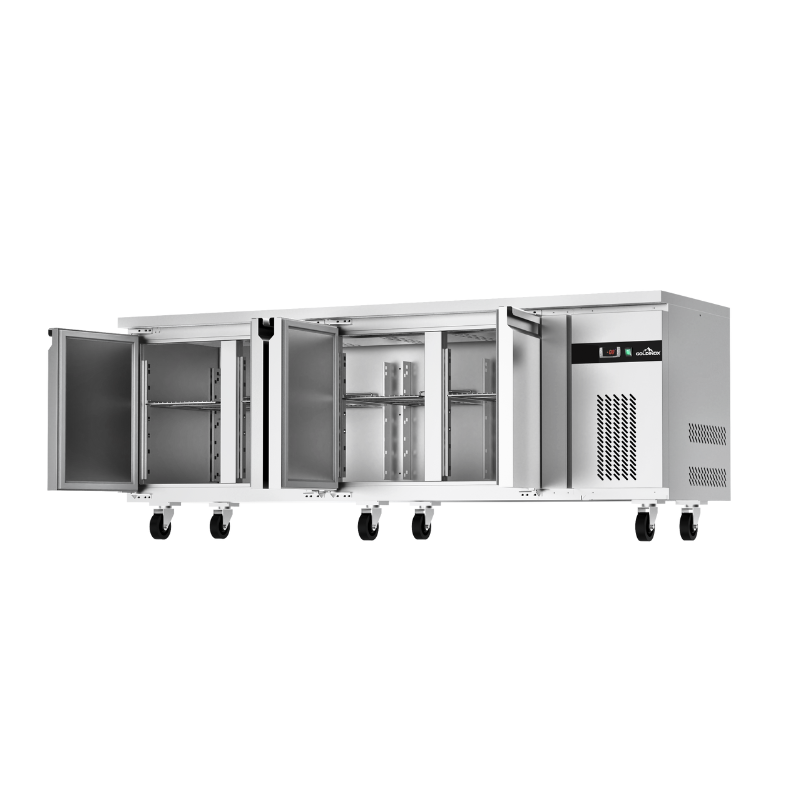La table réfrigérée tropicalisée 4 portes PREMIUM de GOLDINOX représente l'excellence en matière de conservation alimentaire pour les professionnels de la restauration et de l'hôtellerie. Conçue pour répondre aux exigences les plus strictes des cuisines professionnelles, cette table réfrigérée allie performance, durabilité et praticité.